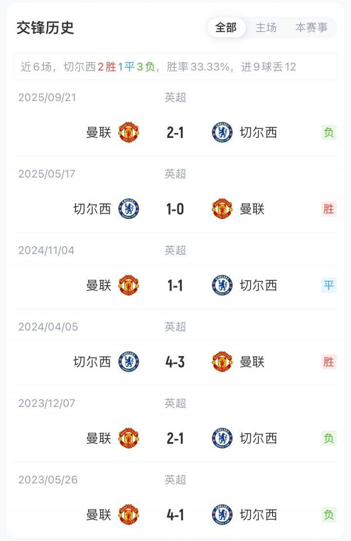 切尔西联赛13胜9平10负积48分暂位英超第6,距欧冠区4分,联赛近7轮仅1胜;曼联联赛15胜10平7负积55分位居英超第3,目前已连续两轮不胜。切尔西近4次对阵曼联仅1负(2胜1平1负)。