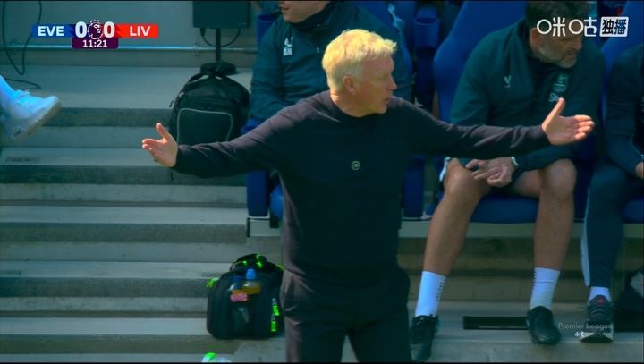 英超第33轮,默西塞德郡德比,埃弗顿vs利物浦,比赛第14分钟,霍尔在禁区与琼斯争抢球权时倒地,裁判示意没犯规,莫耶斯场边表示不满。