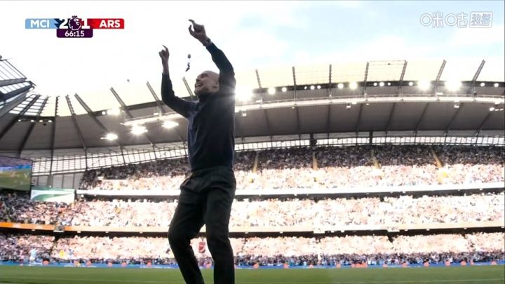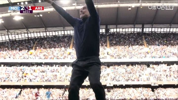 曼城2-1再度领先枪手!瓜迪奥拉场边激动庆祝,跳起双手指向看台
