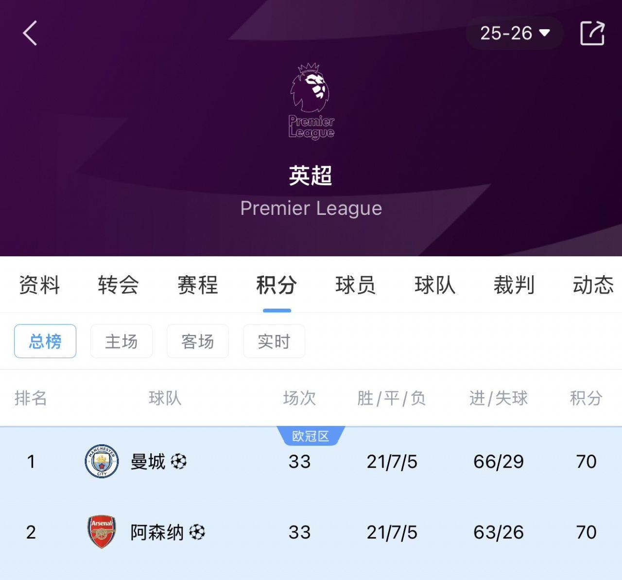 搜体育 足球资讯 不存在附加赛可能!曼城枪手同分将比较净胜球、进球数、交手战绩