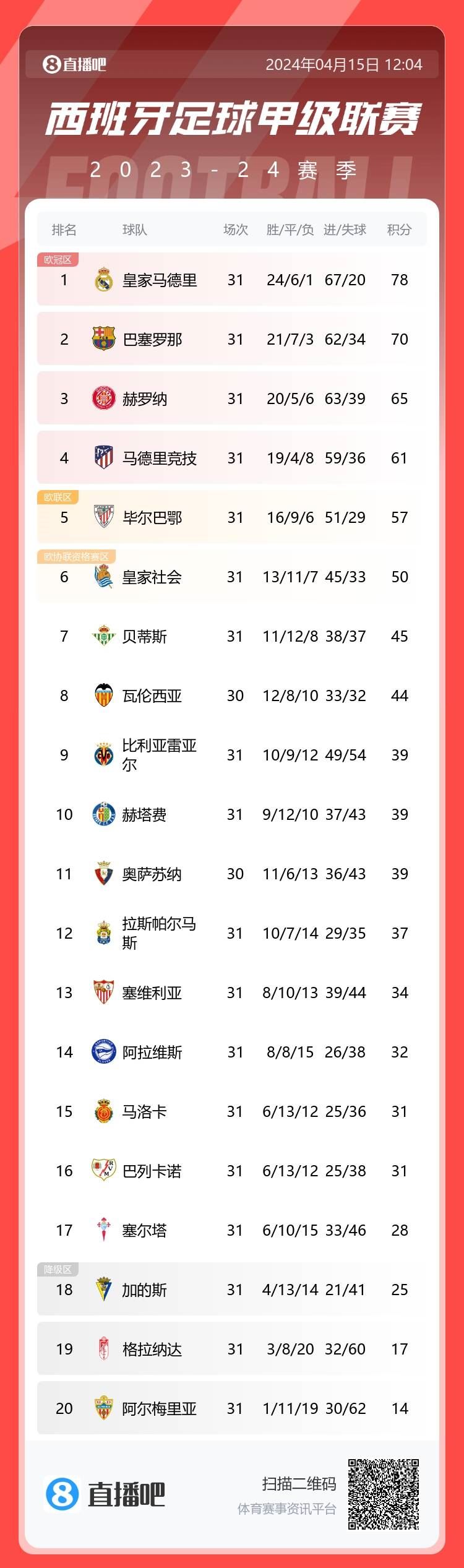 在西班牙的赛场上,皇马以78分的积分稳居榜首,领先巴萨高达8分,冠军之争看似已成定局。赫罗纳以65分位列第三,而马竞则紧随其后,位列第四。这一战场上,虽已有领先者,但战斗尚未结束,谁又敢断言最后的胜者?