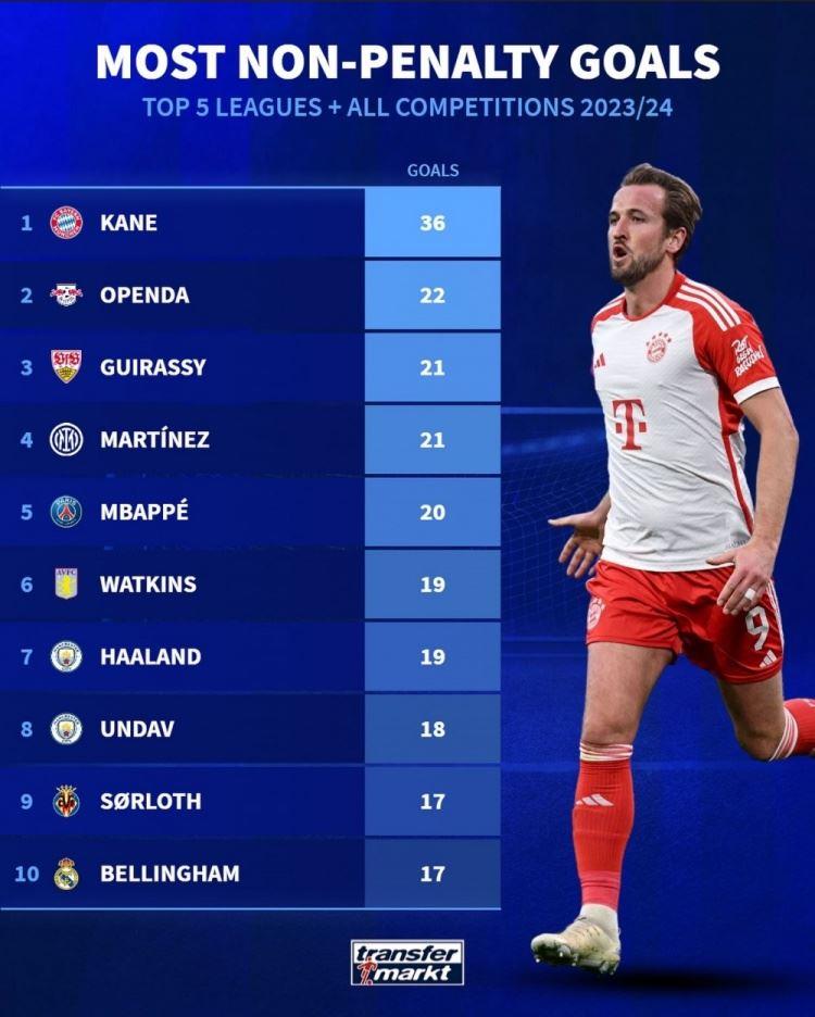 德国转会市场统计了本赛季五大联赛球员在联赛中的非点球进球数量,并列出榜单,凯恩以31球居首,奥蓬达22球次席、吉拉西、劳塔罗21球并列第三。