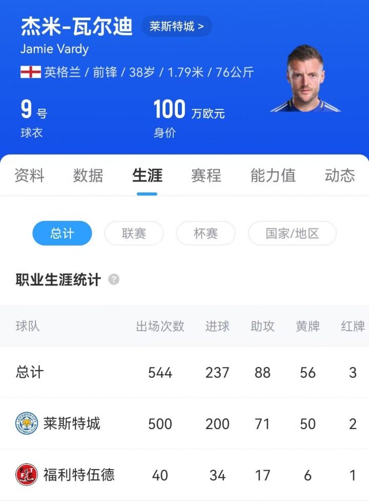 现年38岁的瓦尔迪将职业生涯绝大部分时间都献给了莱斯特城,共为莱斯特出场500次,贡献200球71助攻;并帮助球队获得15-16赛季的英超冠军等荣誉。今年夏天,瓦尔迪与莱斯特城的合同到期,成为自由球员。