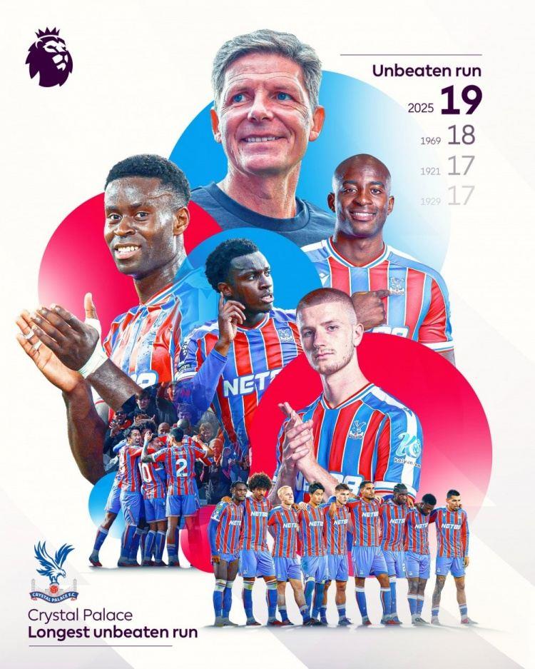 水晶宫各赛事19场不败,创造队史最长不败纪录。