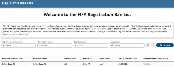 FIFA官方消息,国际足联注册禁令披露系统9月29日公布新增北京国安一条禁令,禁令为无限期直至案件解决。