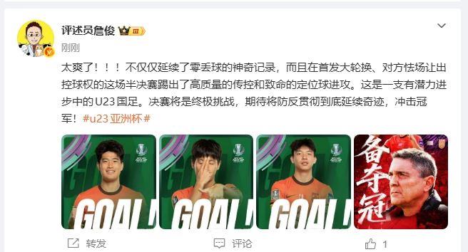 评述员詹俊转发海报,并发文评价比赛。