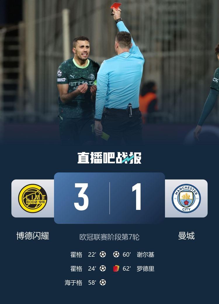 十人曼城1-3不敌博德闪耀,各项赛事两连败;博德闪耀取得本赛季欧冠首胜!