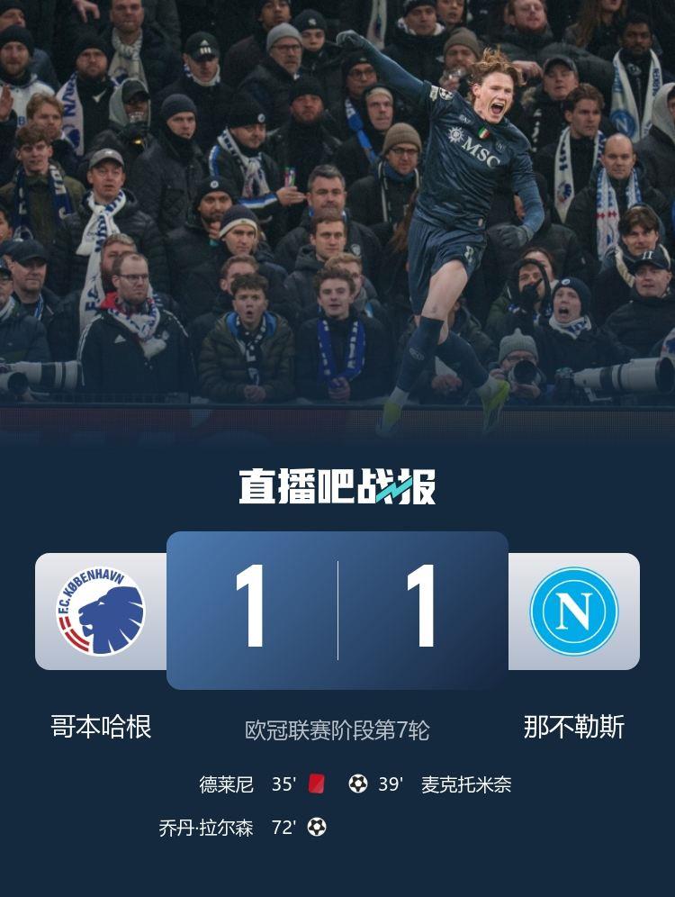 那不勒斯1-1十人哥本哈根,麦克托米奈破门。