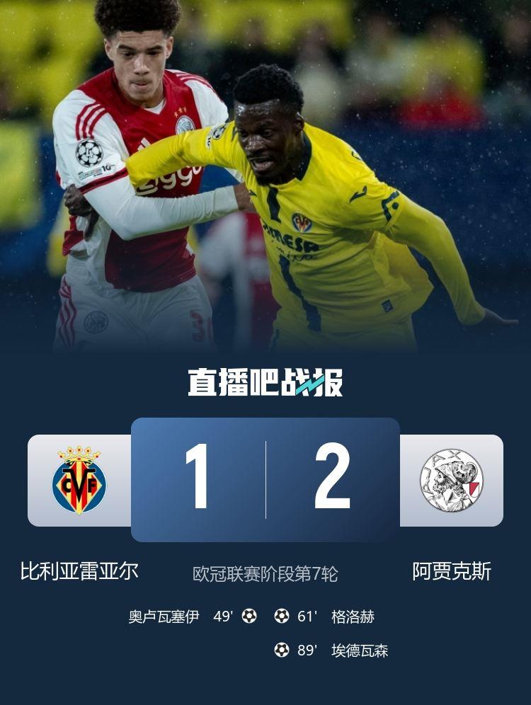 比利亚雷亚尔1-2遭阿贾克斯逆转,7轮不胜!