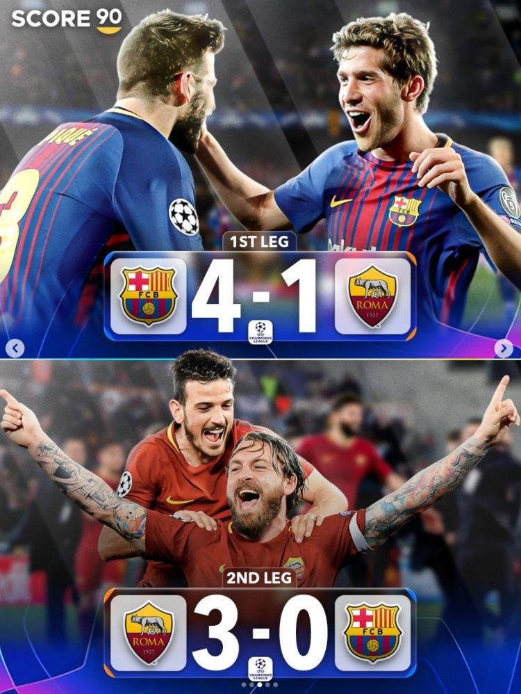 首回合巴萨4-1罗马,次回合罗马3-0巴萨
