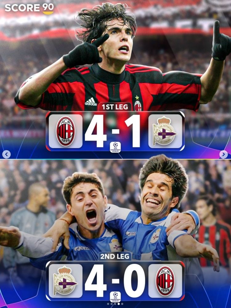 首回合米兰4-1拉科鲁尼亚,次回合拉科鲁尼亚4-0米兰