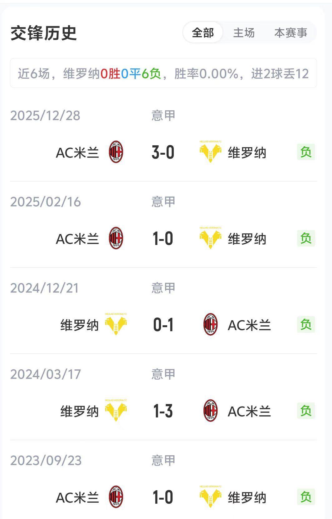 米兰近期联赛两连败,联赛18胜9平5负积63分位居意甲第3。维罗纳联赛四连败,联赛3胜9平20负积18分排名第19。首回合交锋米兰主场3-0战胜维罗纳。
