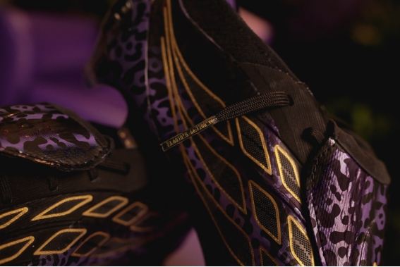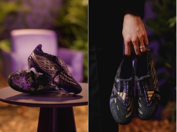 卡卡专属签名款PREDATOR战靴以黑色为主色调,鞋面饰有随光影流转的幻彩美洲豹印花,呈现深邃紫与暗调的渐变效果。鞋身外侧饰有标志性三条纹并搭配金色细节,提升整体质感。鞋身多处融入卡卡专属签名标识与文字元素,其中鞋带顶端更暗藏他职业生涯关键球场的坐标——圣保罗莫伦比球场、米兰圣西罗球场、马德里圣地亚哥·伯纳乌球场以及奥兰多Inter&Co球场。这一细节为战靴赋予了独一无二的个人叙事,将战靴与卡卡的职业生涯历程深度联结。